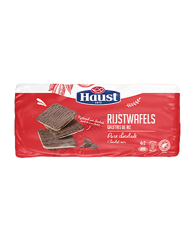 Haust rijstwafels met purechocoladecoating. In handige portieverpakking; 4x2 stuks verpakt. Lekker voor onderweg of tussendoor. Dit product is glutenvrij.